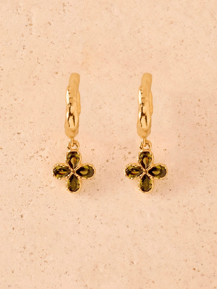 A four-leaf clover pendant on small hoop earrings, hand-set in gold with a textured and irregular finish. Each leaf is formed by a deep green, pear-cut stone.