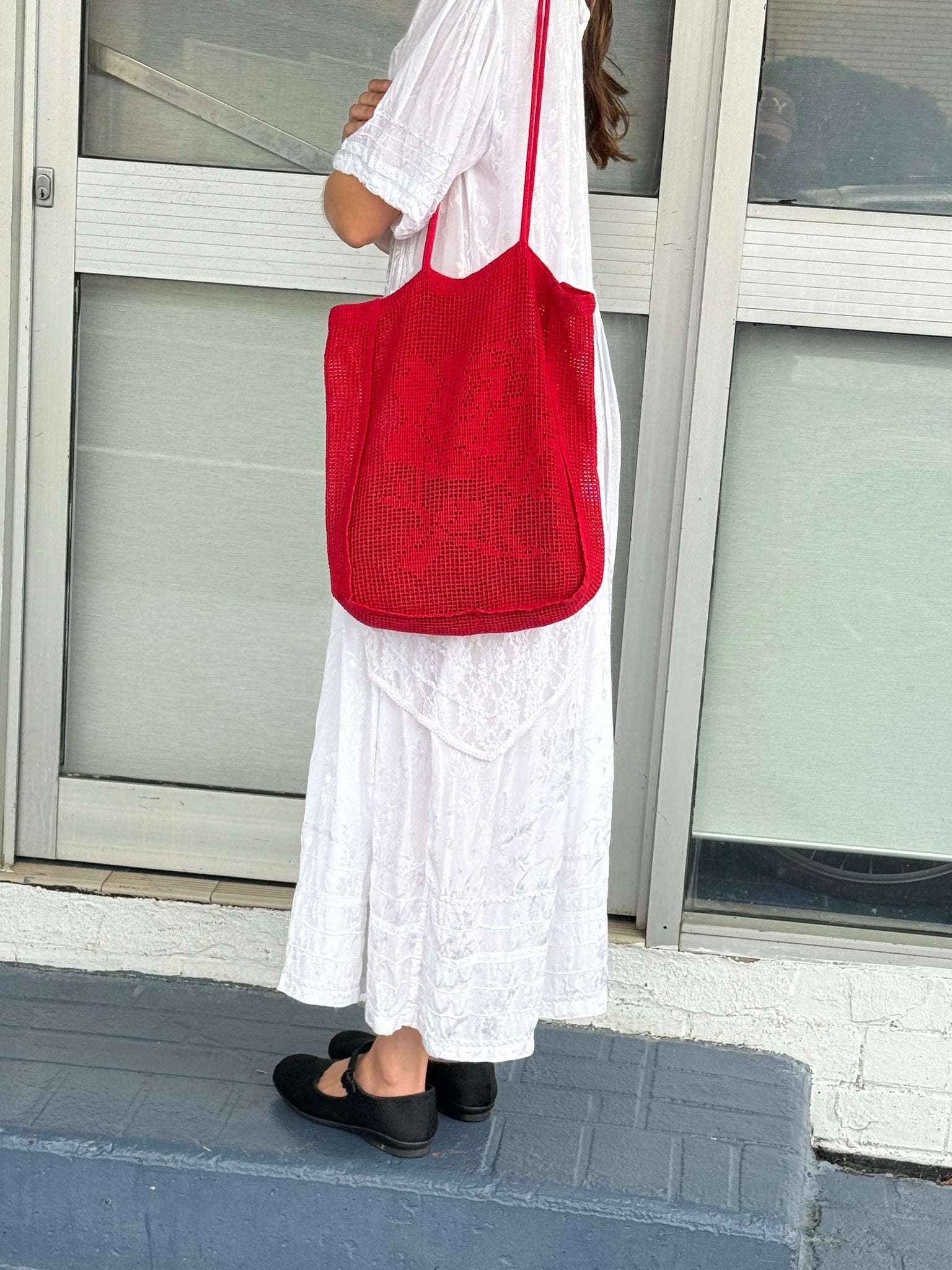 A vintage inspired rose motif crochet shoulder bag with sturdy cord handle and new internal opening tape for structure