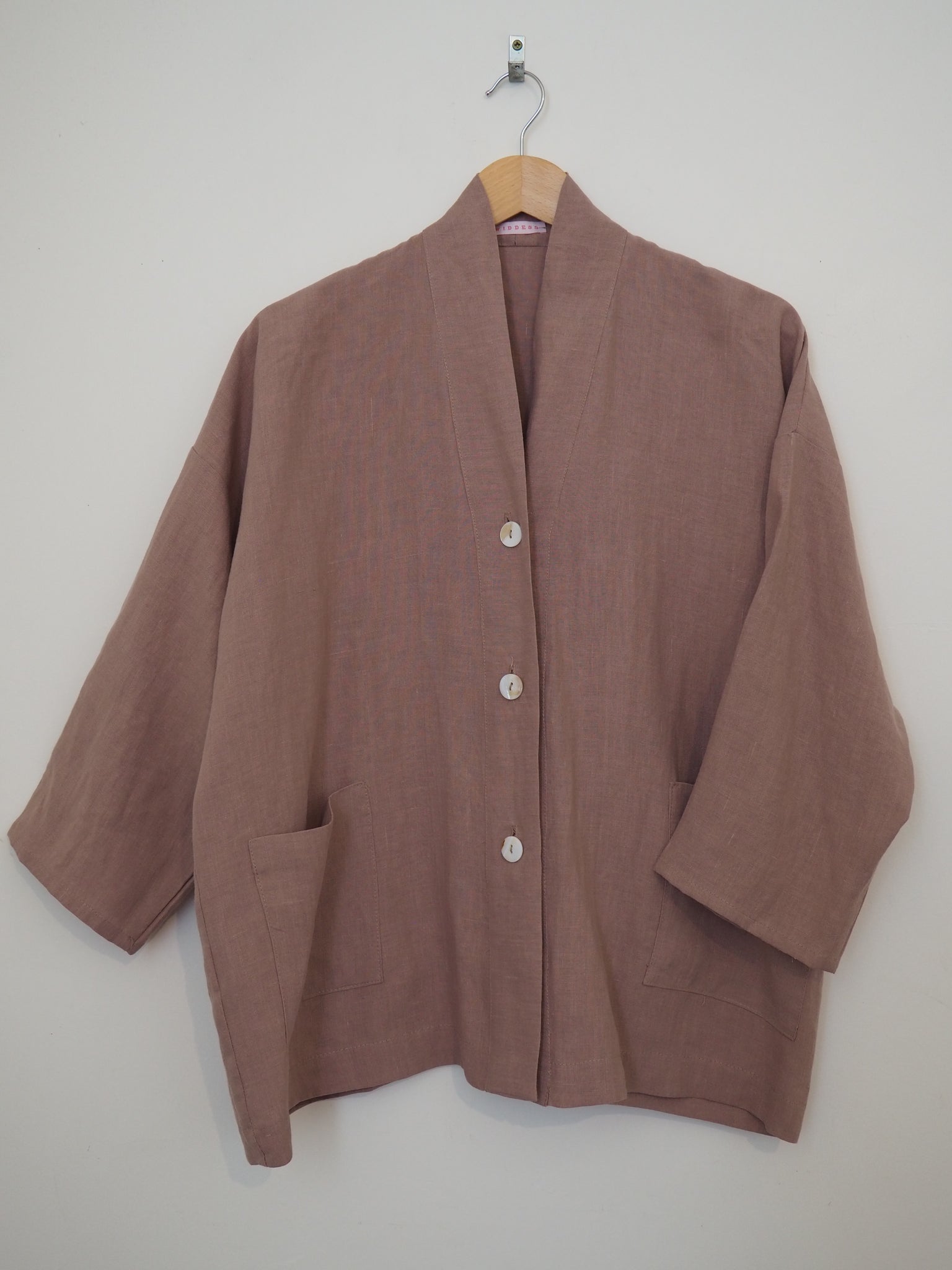 A relaxed silhouette kimono style jacket with patch pockets and featuring unique hand appliqué on the back.