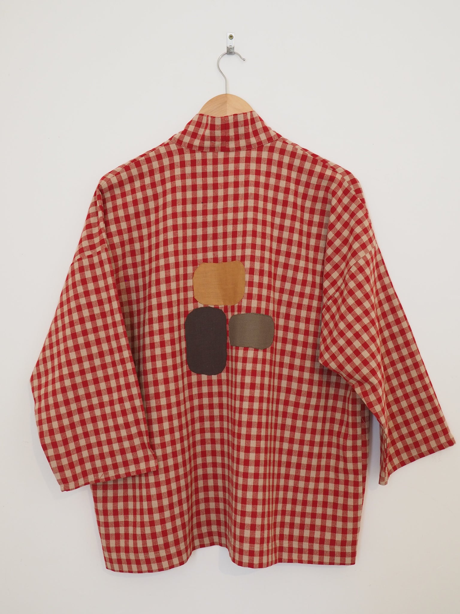A relaxed silhouette kimono style jacket with patch pockets and featuring unique hand appliqué on the back.