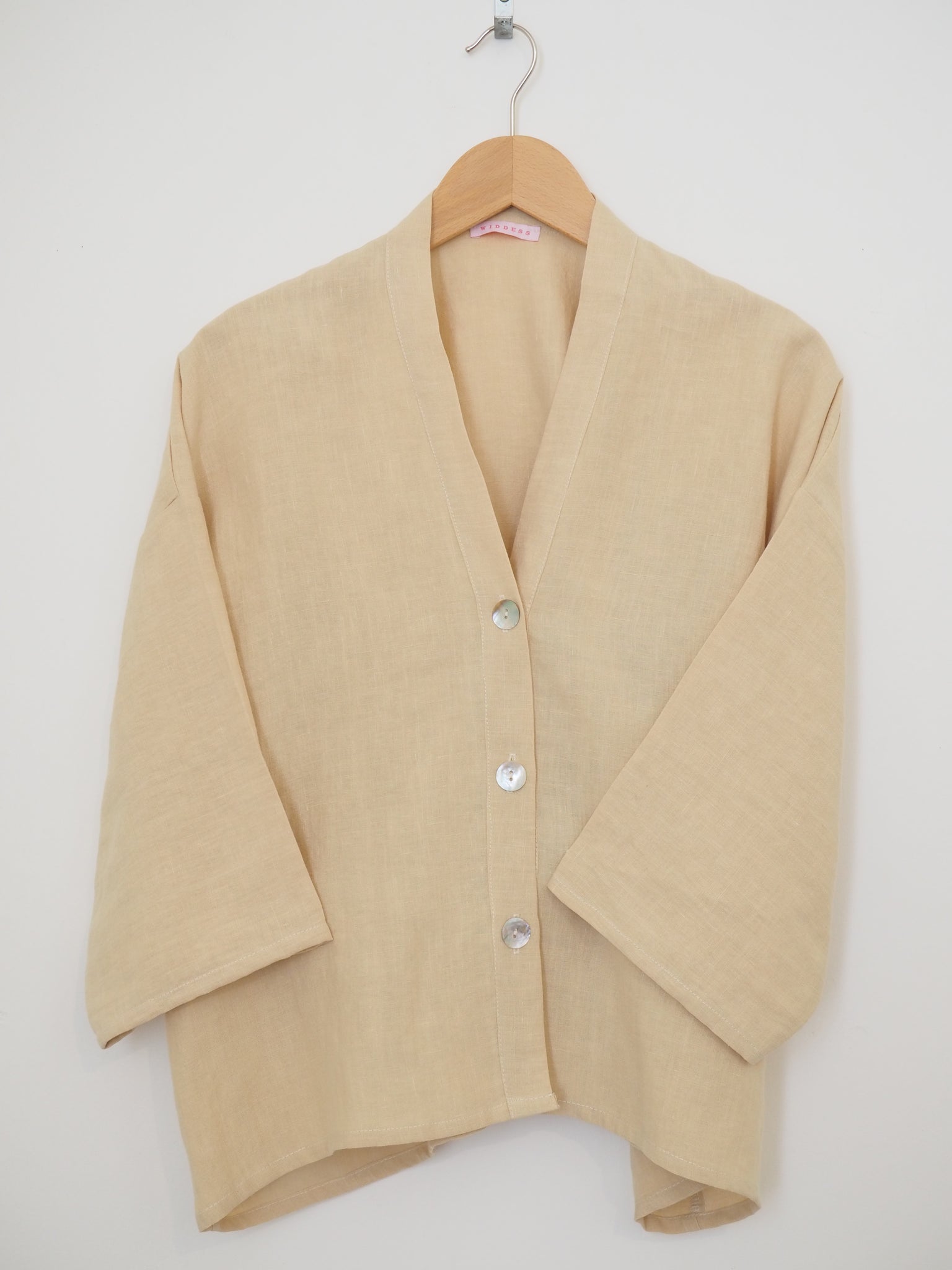 A classic and easy to wear light jacket kimono style shirt. The Temple is a relaxed fit and features natural shell buttons. Shorter than our Kiki kimono with a shorter sleeve.
