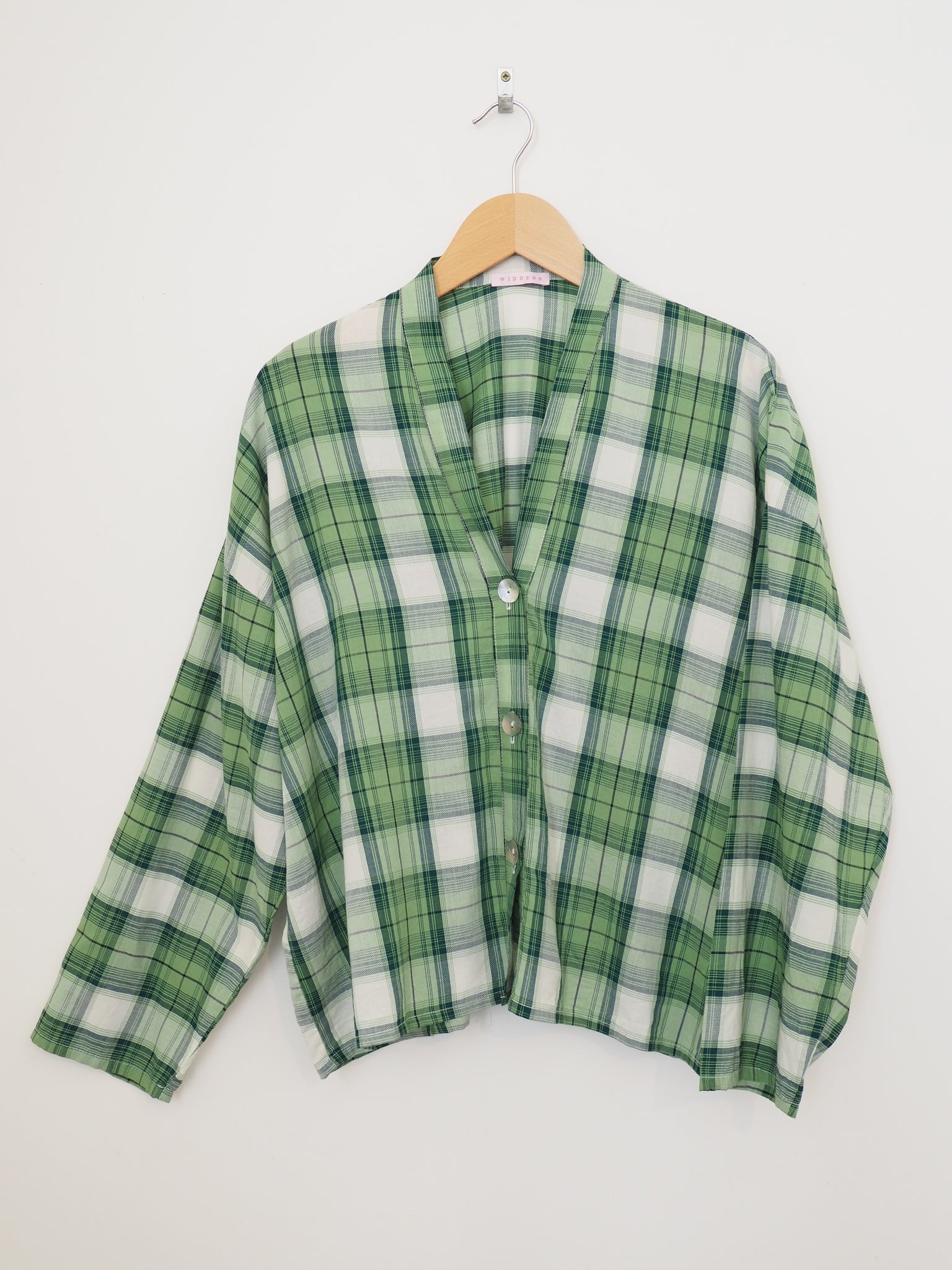 A classic and easy to wear light jacket kimono style shirt. The Temple is a relaxed fit and features natural shell buttons. Shorter than our Kiki kimono with a bracelet length sleeve.